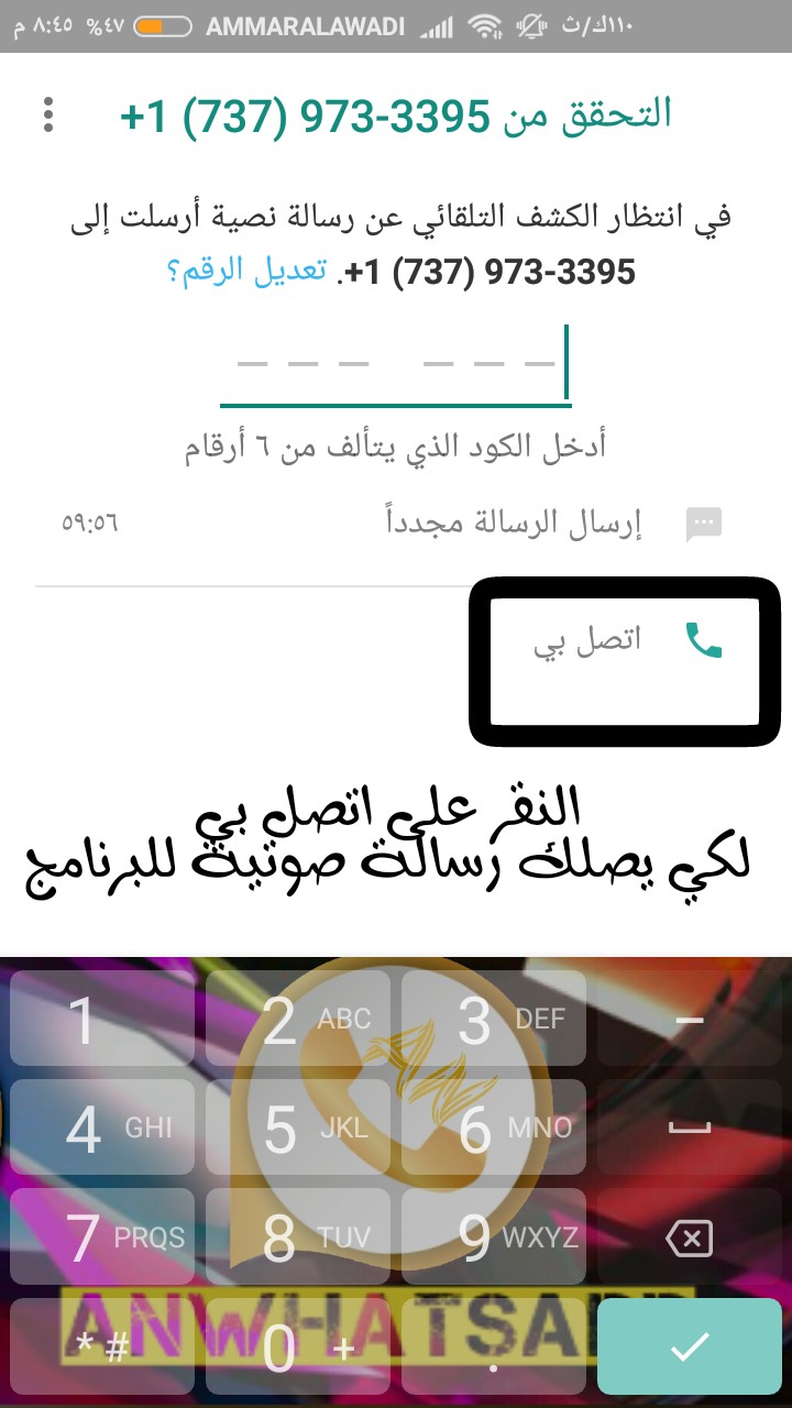 ثامناً/ نقوم بالنقر على اتصل بي بالوتس اب لكي تصلك رسالة صوتية تحمل رمز تأكيد واتس اب كما هو موضح بالصورة ادنى.